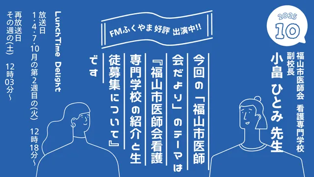 FMふくやま「福山市医師会看護専門学校の紹介と生徒募集について」をテーマに小畠副校長が出演されました。2025年10月14日放送:福山市医師会 看護専門学校 副校長 小畠ひとみ 先生☆テーマ:福山市医...