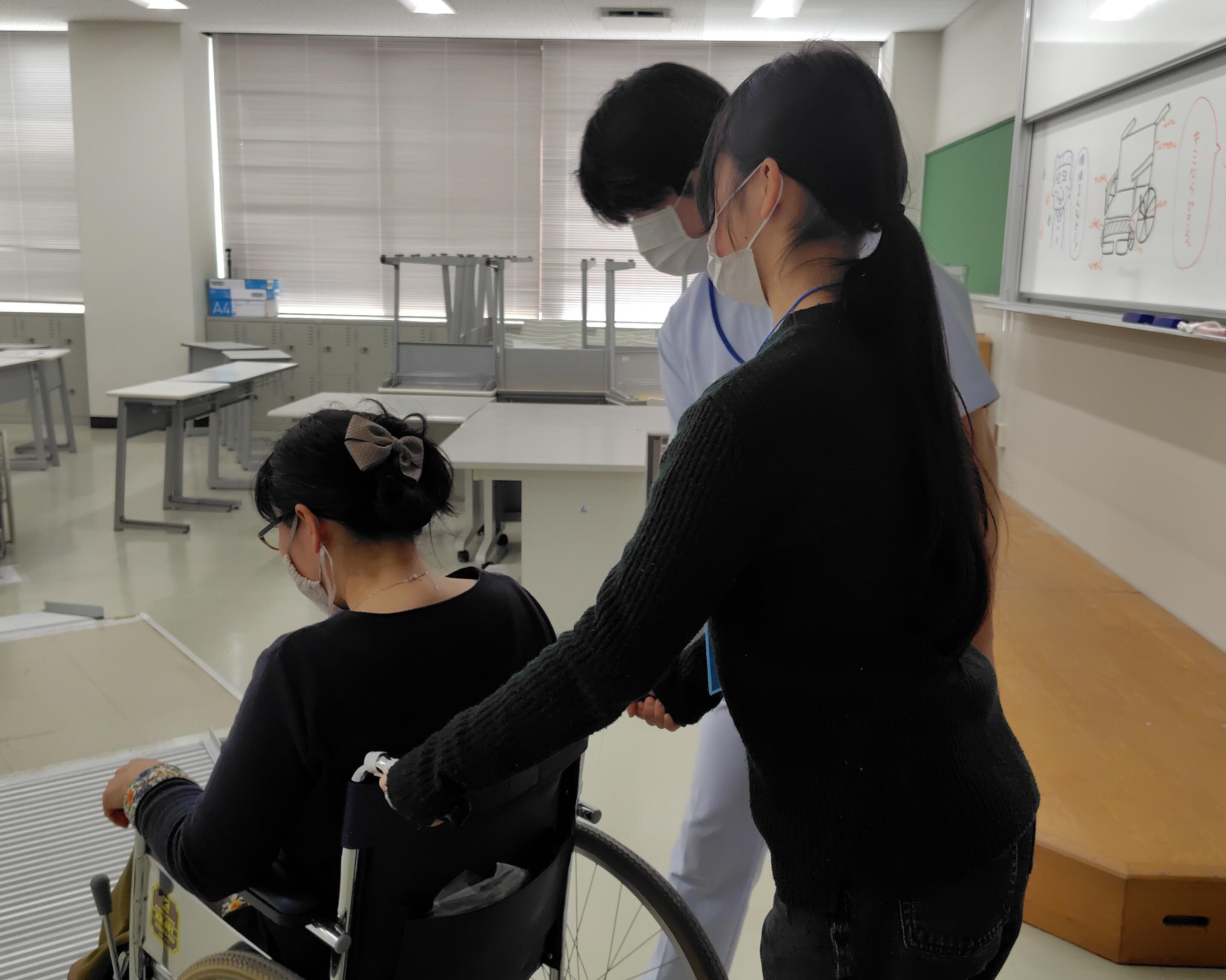 車椅子に乗ったり、操作したりして、スロープやカーブなどを体験しました。