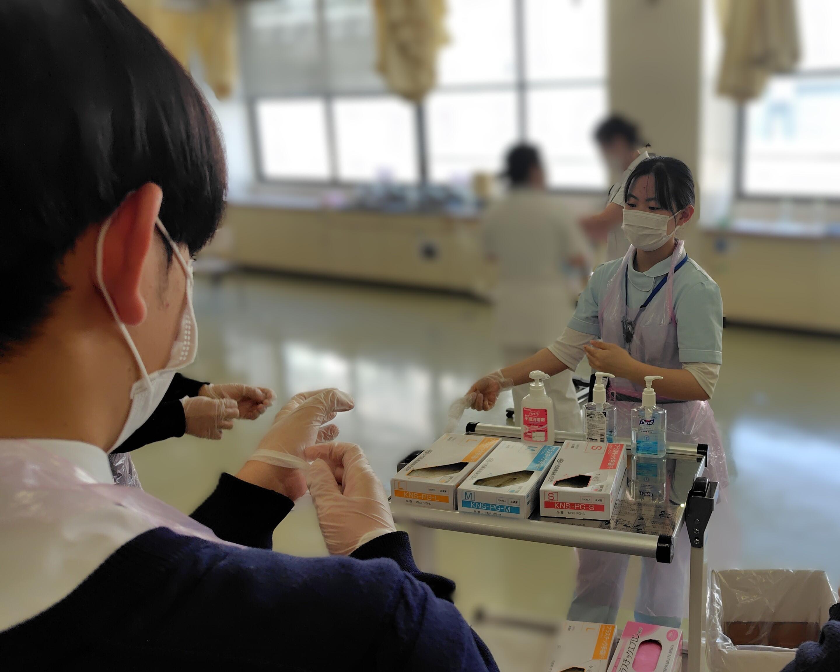 感染予防のための手袋やエプロンの正しい着脱方法を体験しました。