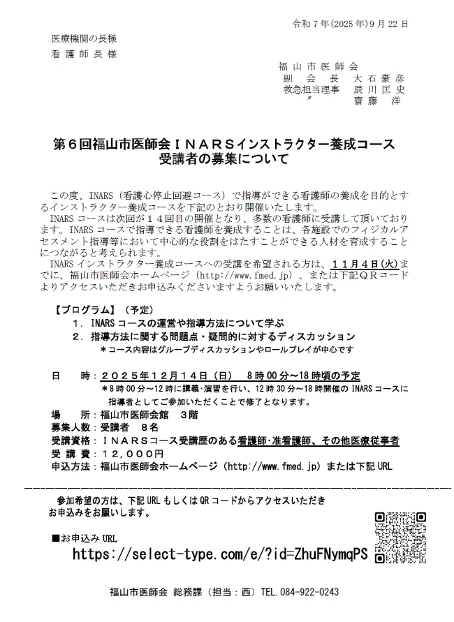 第6回福山市医師会INARSインストラクター養成コース受講者の募集について