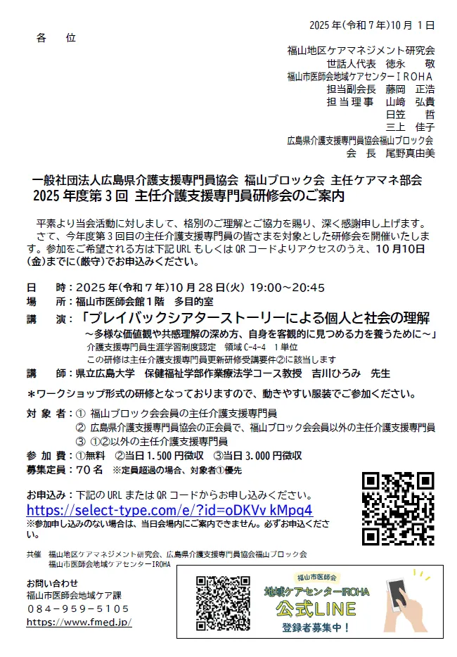 一般社団法人広島県介護支援専門員協会 福山ブロック会 主任ケアマネ部会 2025年度 第3回 主任介護支援専門員研修会のご案内