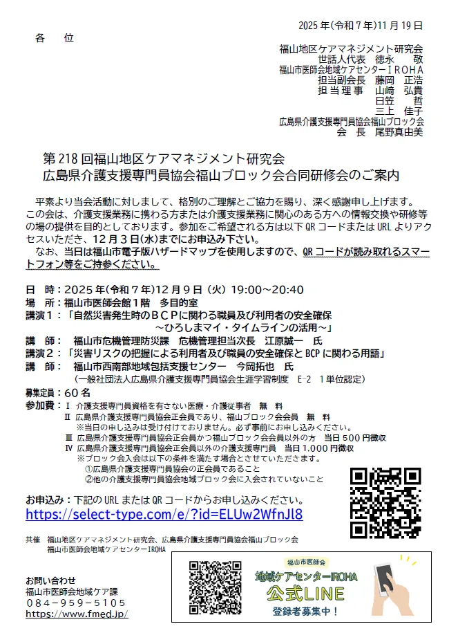 第218回福山地区ケアマネジメント研究会 広島県介護支援専門員協会福山ブロック会合同研修会のご案内