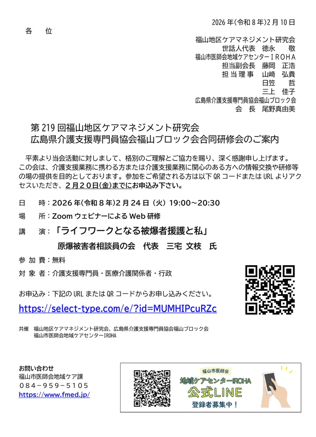 第219回福山地区ケアマネジメント研究会 広島県介護支援専門員協会福山ブロック会合同研修会のご案内