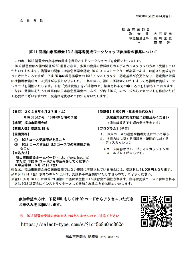 第11回福山市医師会ICLS指導者養成ワークショップ参加者の募集について